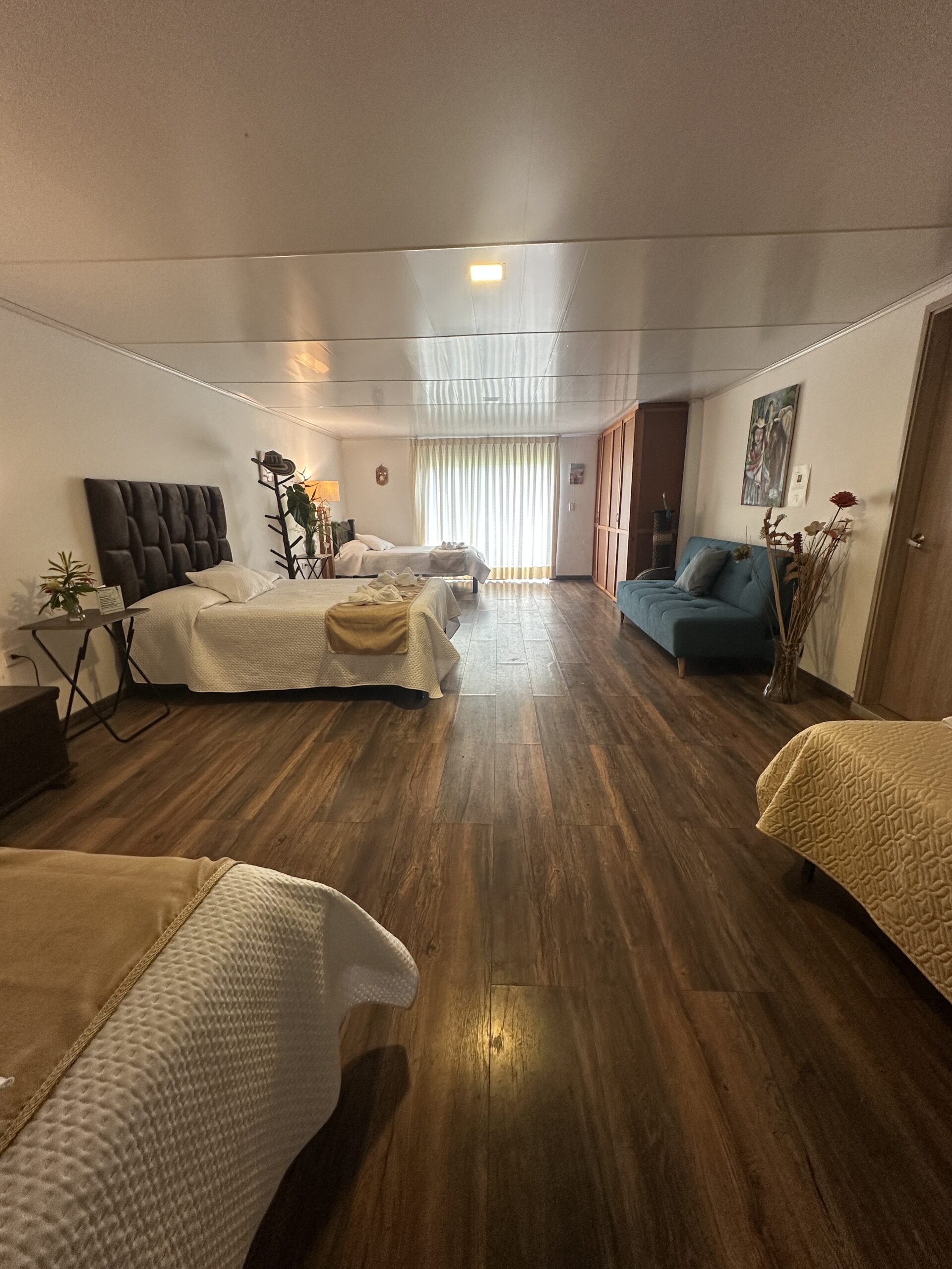 Cuenta con una cama matrimonial y tres camas individuales, además de un baño privado amplio y completamente equipado, pensado para brindar el máximo confort.